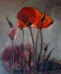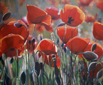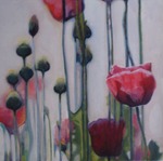 2009De bloemserie is een serie gemaakt met wisselende bloemen schilderijtjes om te varieren in een mozaiek of patchwork. Poppy is een klaprozen veldje met poederachtige rozegekleurde klaprozen met kwetsbare steeltjes in blauwgroen.