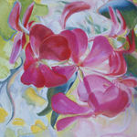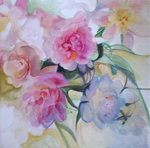 2009Bloemenserie waarin elk schilderij een deel van een geheel kan vormen in een mozaiek of patchwork. Pioenrozen in pastels