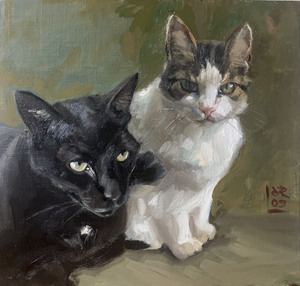2021Portret van 2 poezen. Zwart en bont gekleurd
